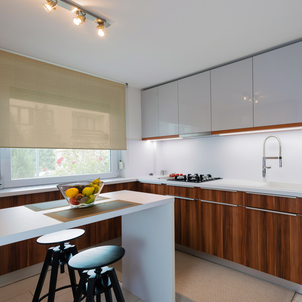 - ในการตกแต่งห้องครัวเลือกใช้งานไม้มาประดับตกแต่ง เพราะให้ความรู้สึกที่อบอุ่นแบบธรรมชาติ และให้ความเป็นโมเดิร์นทันสมัย โดยสามารถเลือกใช้ม่านม้วนซันสกรีนสีครีมที่เข้ากับการตกแต่งด้วยงานไม้ ทำให้สัมผัสถึงความอบอุ่นสบายอย่างสวยงาม