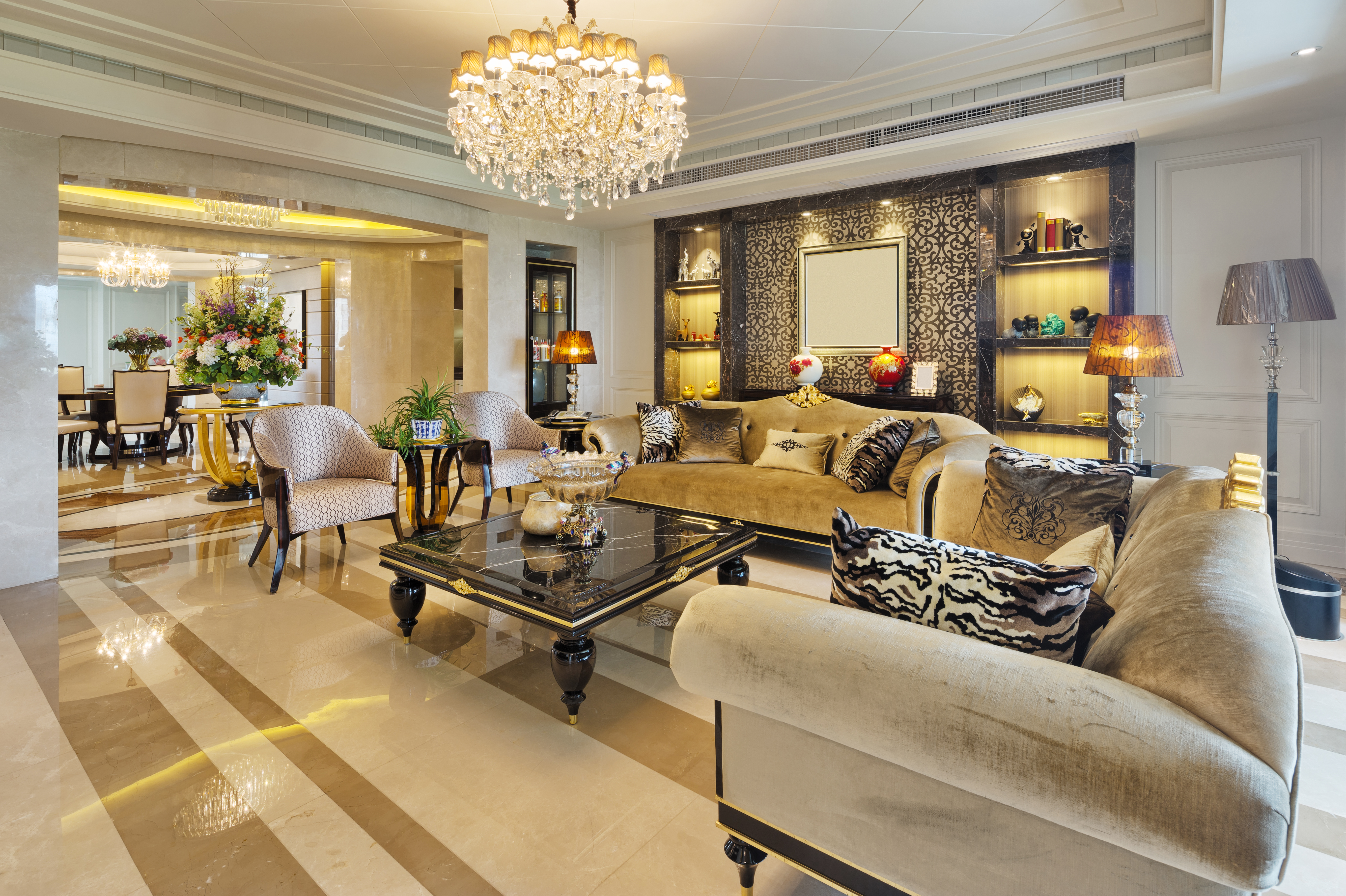 - ห้องโล่งโปร่งสบายเพราะมีสีขาวเป็นสีพื้นฐานอยู่เเล้ว ออกแบบพนังด้วยลวดลายดอกไม้ที่มีความประณีตสวยงามด้วยสีดำและสีทองที่คู่กันอย่างลงตัว ตรงกลางห้องคงขาดไม่ได้กับโคมไฟช่อใหญ่ที่ดูหรูหรา และมีการจัดโซฟาสีเทานุ่มๆที่มีราคาแพงเพื่อไว้ต้อนรับแขกอย่างสวยงาม