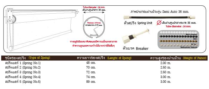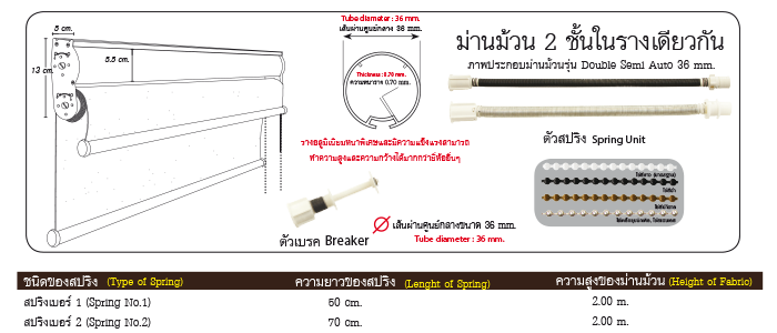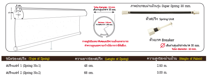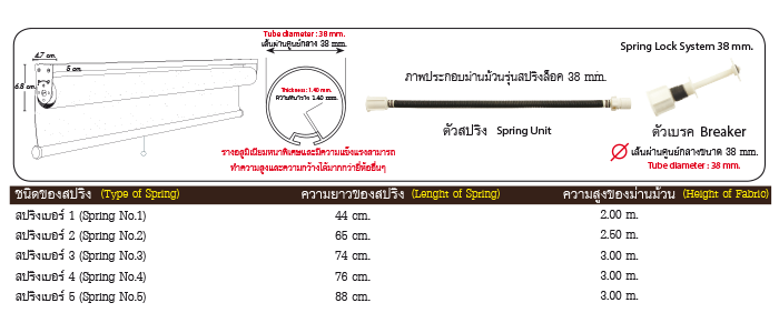 ม่านม้วนรุ่นนี้ใช้งานไม่ยุ่งยากบวกเข้ากับผ้าโปร่ง มีจุดเด่นในการควบคุมแสงให้มีความนุ่มนวล มีรางกลมขนาดเส้นผ่าศูนย์กลาง 38 มม. สามารถรับน้ำหนักผ้าได้มาก เหมาะกับคนที่ชอบแต่งบ้านสไตล์เรียบง่ายแต่ทันสมัย และไม่ชอบผ้าม่าน ในการทำงานของม่านสปริงล็อคเพียงดึงกระตุกตรงเชือกที่อยู่ตรงกลางของม่านม้วนและตัวใบ ม่านม่วนก็จะเลื่อนขึ้นโซ่สปริงก็จะล็อคเองด้วยอัตโนมัติ สมกับท่านที่มีไลฟ์สไตล์เป็นของตัวเองที่เท่ห์ทันสมัย เหมาะสำหรับ ห้องครัว ห้องรับแขก ห้องทำงาน และห้องน้ำ เป็นต้น